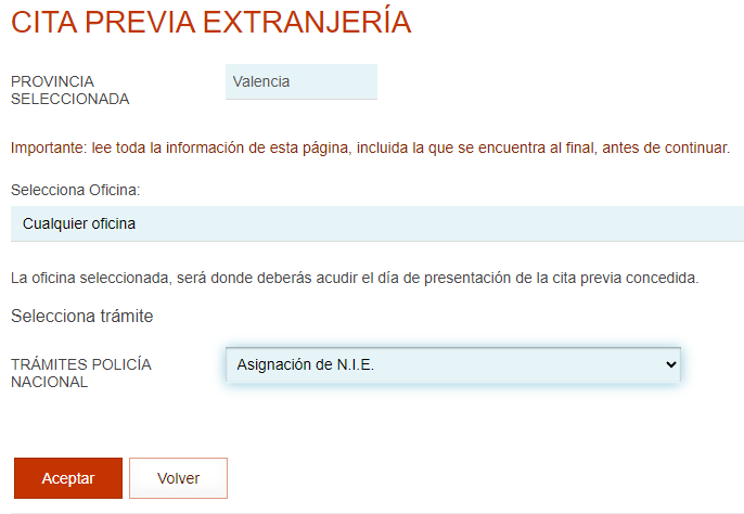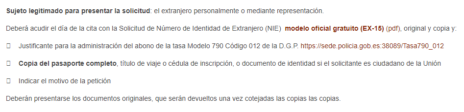 After clicking “Aceptar”, you will be brought to an information page. It discusses what documentation is needed for this appointment. Not all provinces include this, but if you do a quick search for “NIE”, you will often find an email that you can contact to receive your NIE.
