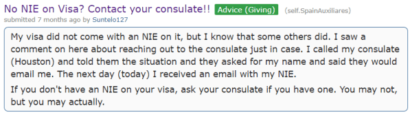 Option 1 – Message the consulate where you applied for a visa: You can request your NIE information from the consulate where you received your visa. Just call or email explaining that your visa does not include your NIE and that you would need it.**