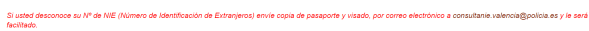 “Si usted desconoce su Nº de NIE (Número de Identificación de Extranjeros) envíe copia de pasaporte y visado, por correo electrónico a consultanie.valencia@policia.es y le será facilitado.“