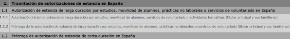 Next, select 1.1.2: Prórroga de la autorización de estancia de larga duración por estudios, movilidad de alumnos, prácticas no laborales o servicios de voluntariado (titular principal y sus familiares)